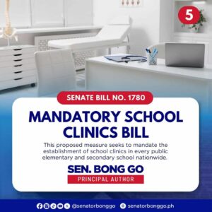 Senator Christopher “Bong” Go is pushing for the institutionalization of school clinics in all public elementary and secondary schools nationwide, citing serious gaps in the availability of on-site health facilities and personnel that directly affect students’ well-being and learning conditions.