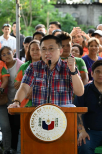 He shared that he left the Senate earlier that day and went straight to the community because he could not ignore the needs of those suffering. “Ako naman po bilang inyong senador, kaya sabi ko, hindi ko matiis na nakaupo sa opisina habang kayo nangangailangan ng tulong. Galing pa po ako sa Senado kanina, tumuloy po ako rito para makatulong,” he said, as residents gathered inside the covered court of GSIS Hills Subdivision for the distribution of assistance.